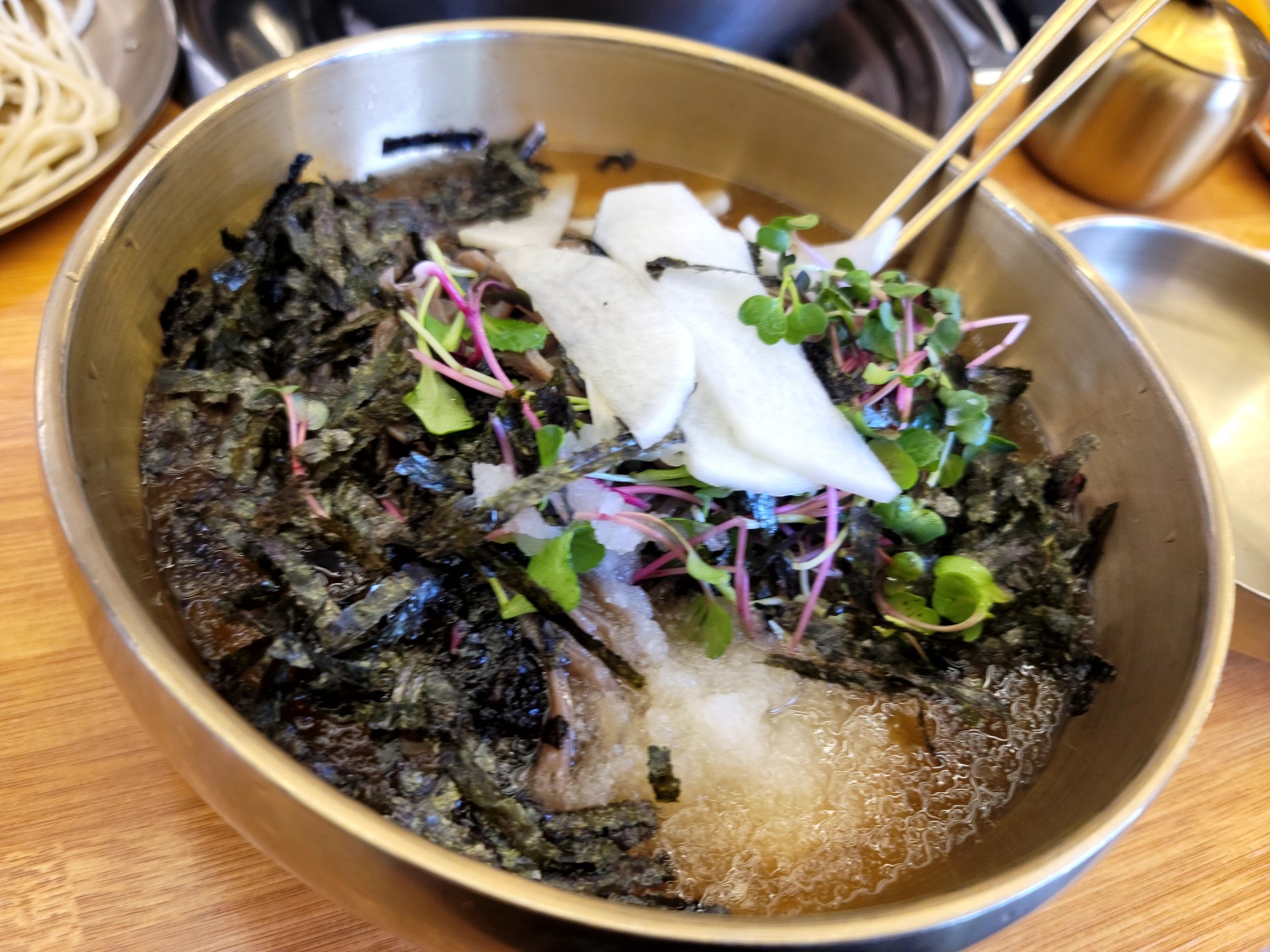 무, 새싹나물, 김가루, 간무와 살얼음이 눈에 보일 정도로