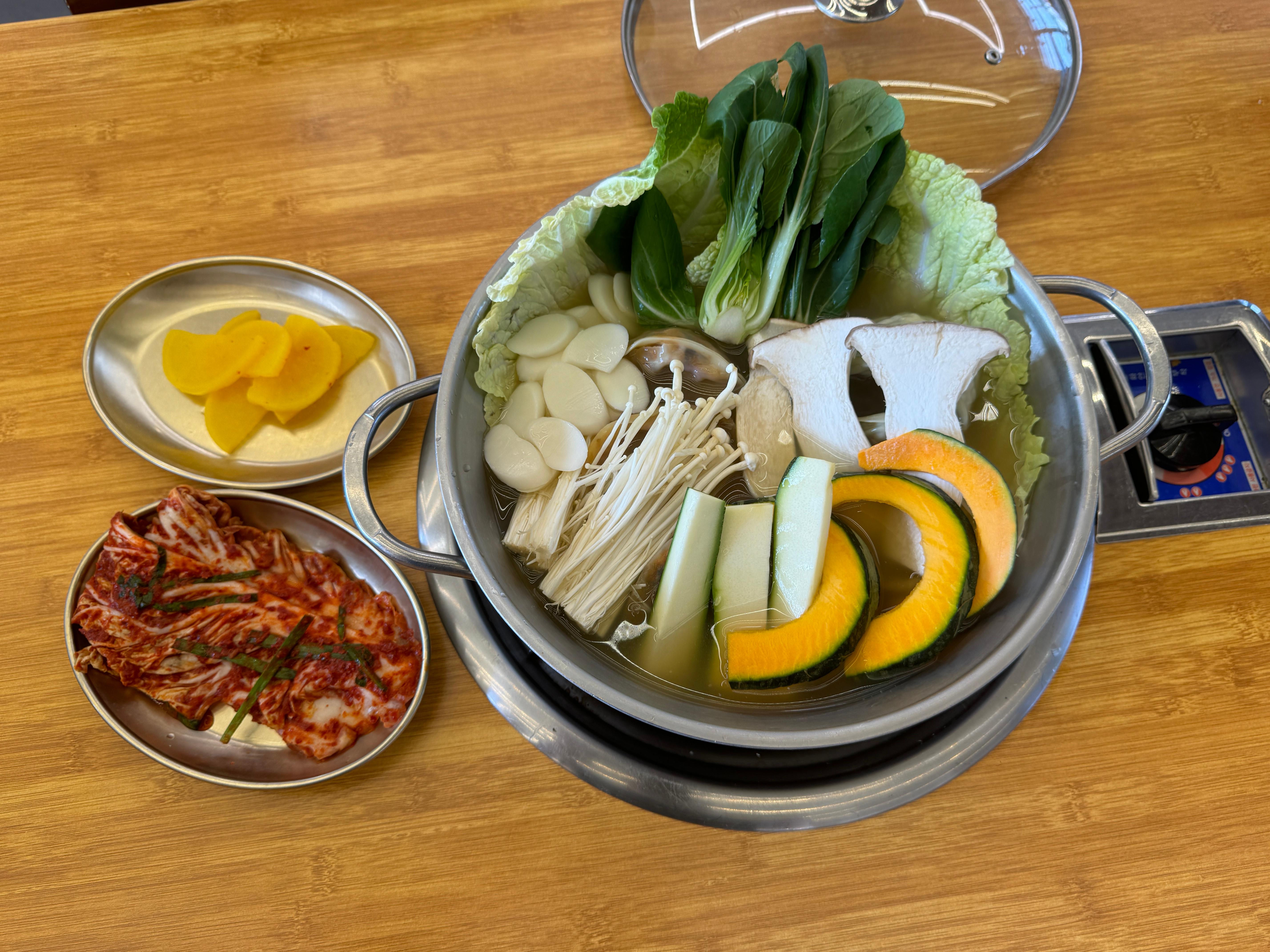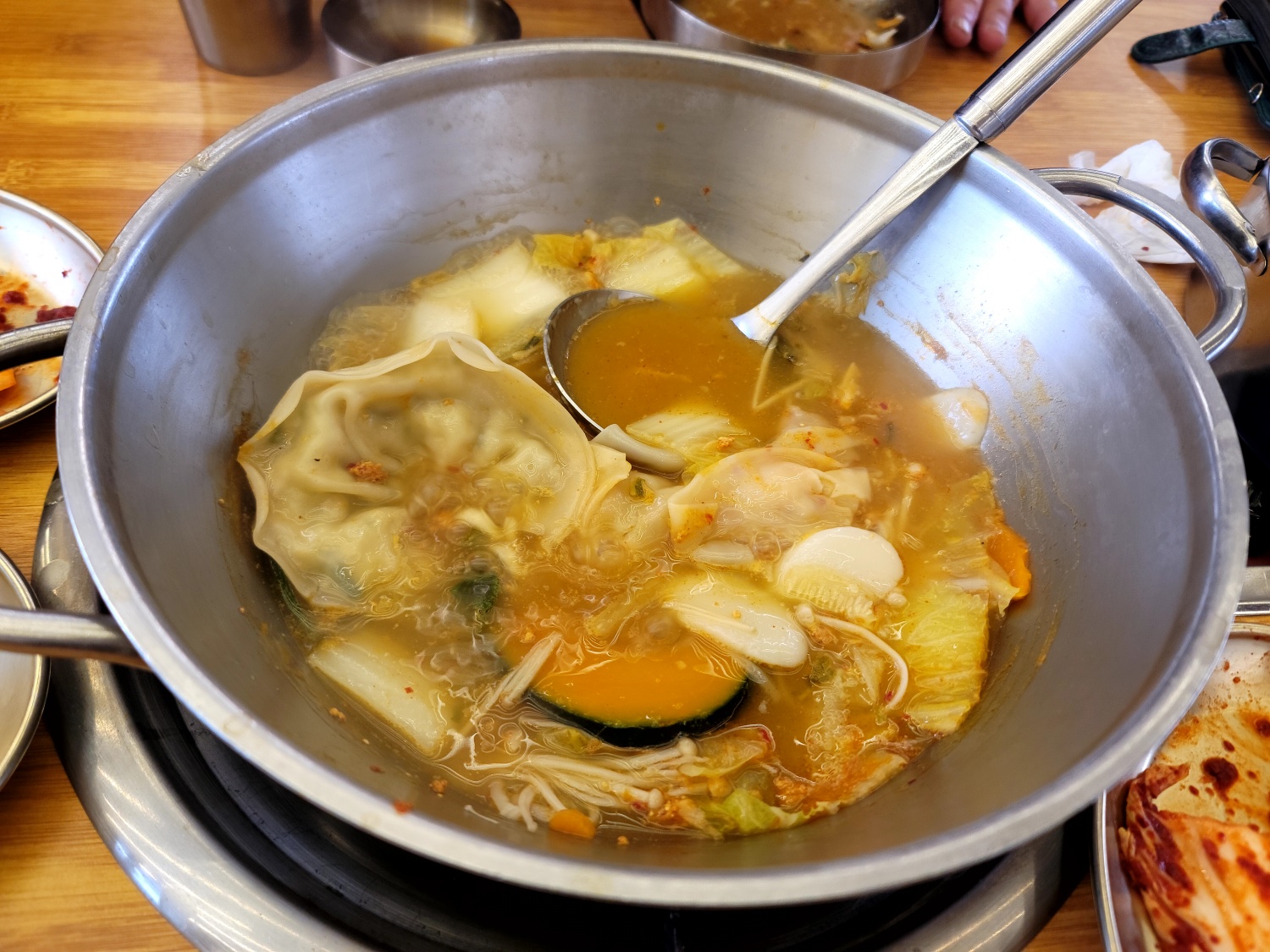 밑반찬과 만두전골 육수는 셀프바에서 리필 가능해요.