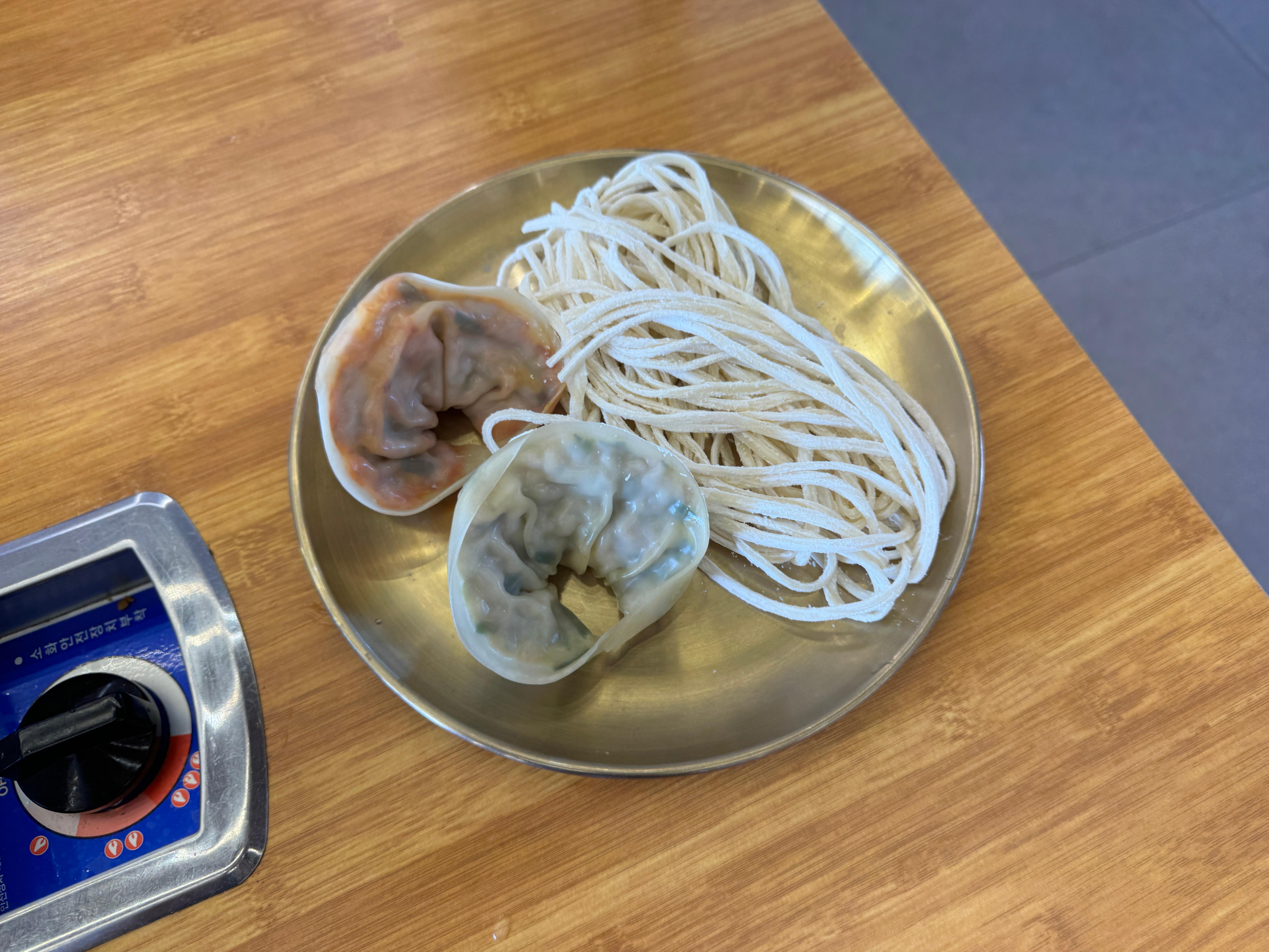 그리고 별도로 칼국수 면사리와 만두가 접시에 답겨져 나와요.